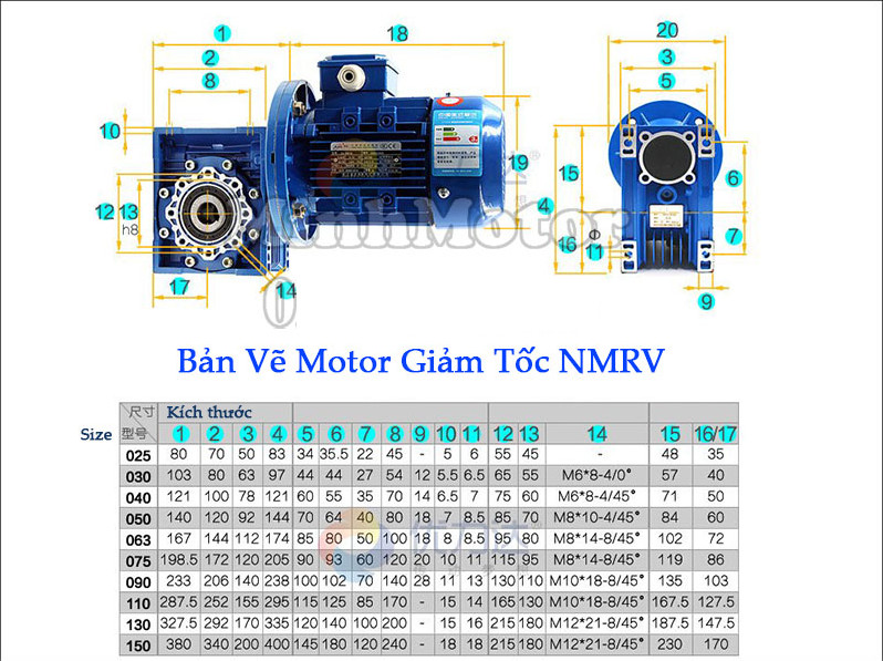 NMRV size 30 Tỉ số truyền: i= 5, 10, 15, 20, 25, 30, 40,50,60,80,100 Lắp motor công suất: 0.18kw=1/1/4hp, Vật liệu vỏ: Hợp kim Nhôm Trục vít bằng thép,bánh vít bằng Đồng...